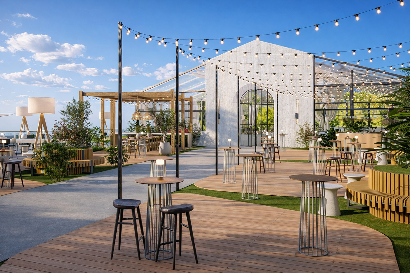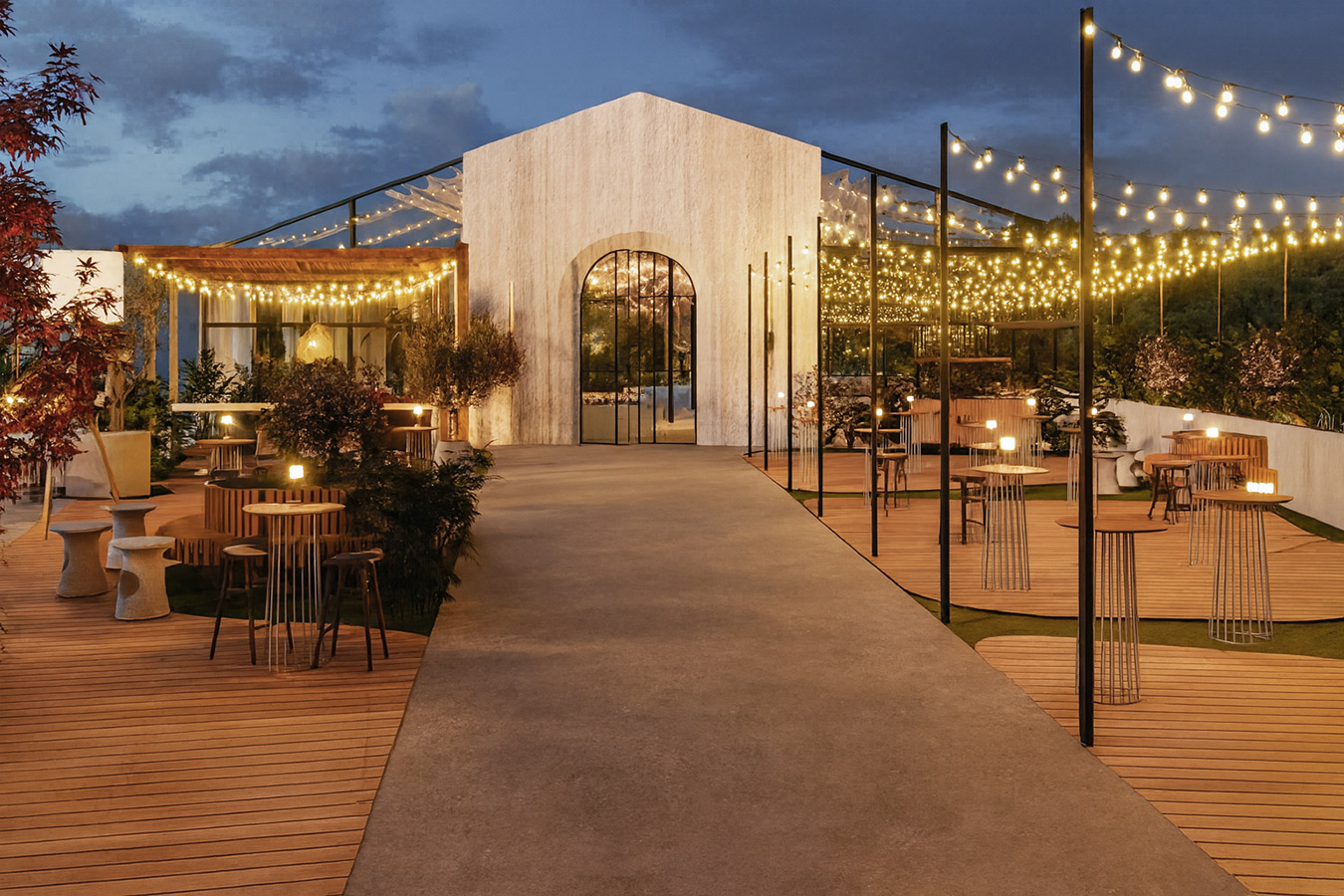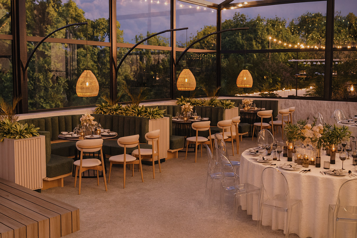 Простор создаден за настани со стил и префинетост, кој вклучува: Пространа сала со можност за различни сценарија и поставености. Надворешен амбиент совршен за елегантни приеми. Иновативен подвижен покрив за максимална флексибилност. Современо уреден ентериер прилагодлив на секој концепт. Целосна приватност и врвен комфор за вас и вашите гости.
