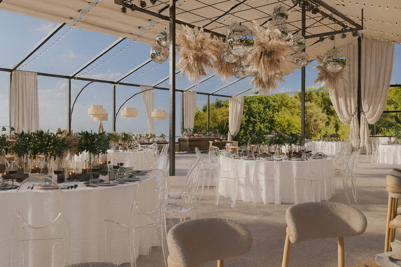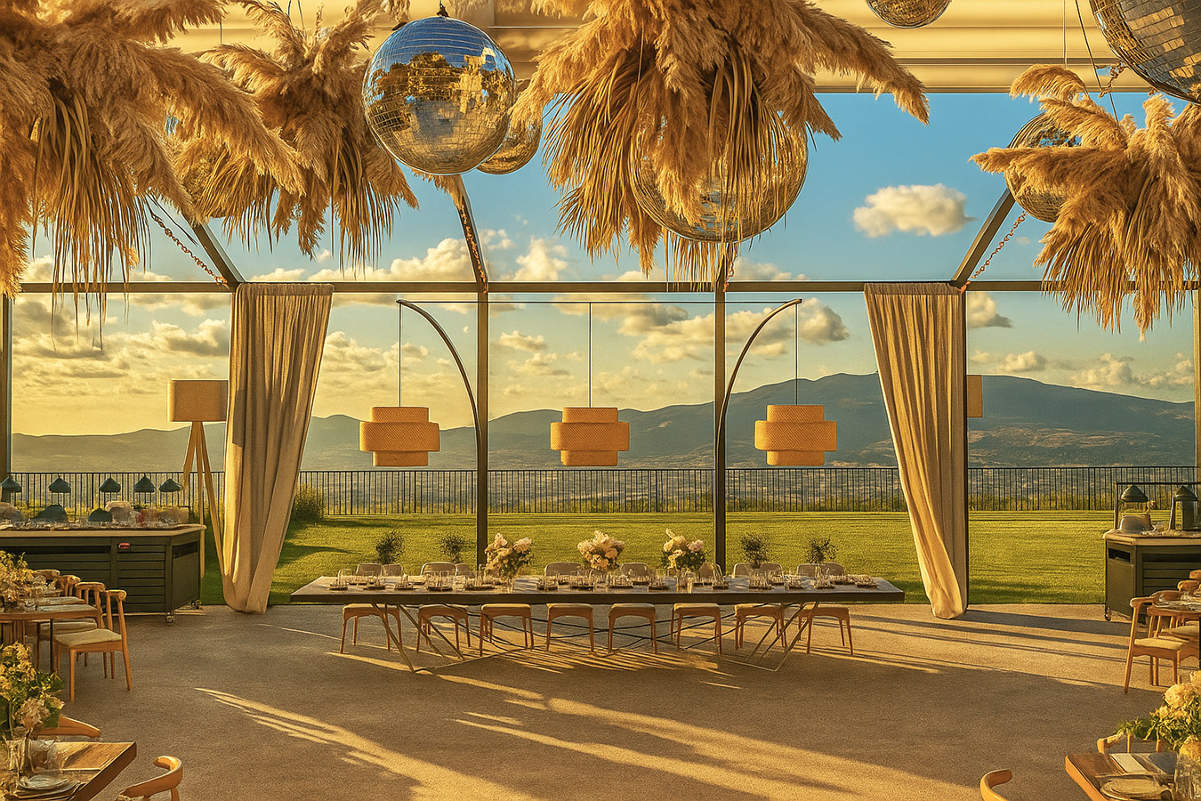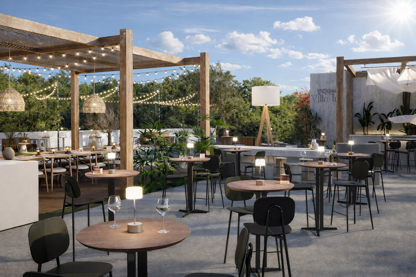 Простор создаден за настани со стил и префинетост, кој вклучува: Пространа сала со можност за различни сценарија и поставености. Надворешен амбиент совршен за елегантни приеми. Иновативен подвижен покрив за максимална флексибилност. Современо уреден ентериер прилагодлив на секој концепт. Целосна приватност и врвен комфор за вас и вашите гости.